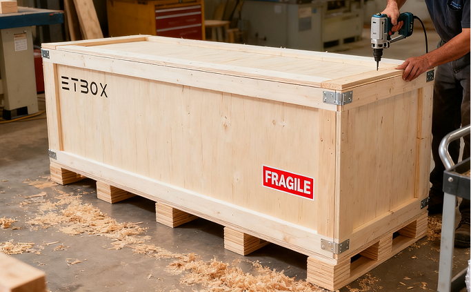 Every shipment from ETBOX follows strict export packaging standards. Products are carefully protected with custom wooden crates, multi-layer foam, waterproof wrapping, and reinforced strapping. Each package is inspected before loading to ensure maximum safety during long-distance transportation.